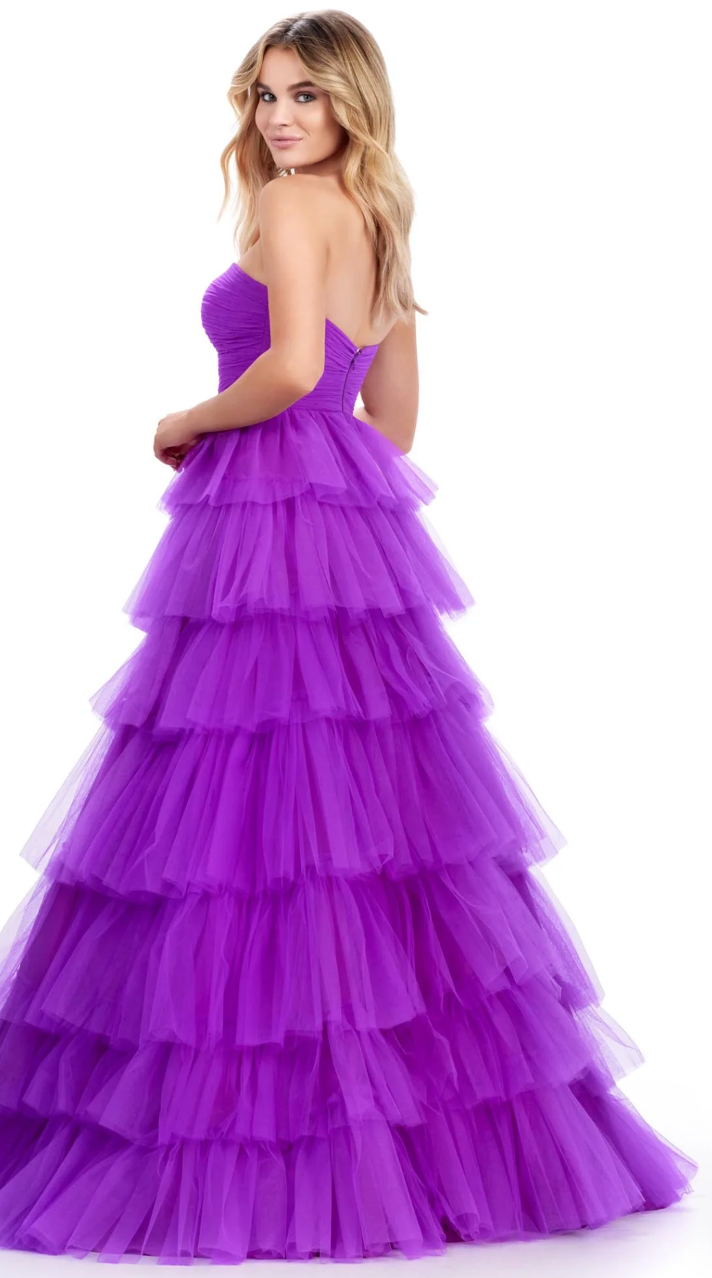 Achieve a timeless classic look with Ashley Lauren 11621. This long layer tulle strapless ballgown has tiered detailing and a fitted sweetheart bodice for a flattering fit. Crafted from luxurious fabrics, this formal gown is perfect for any special occasion. This fun and flirty strapless tulle ball gown features a ruched bustier complete with multi-tiered skirt.
