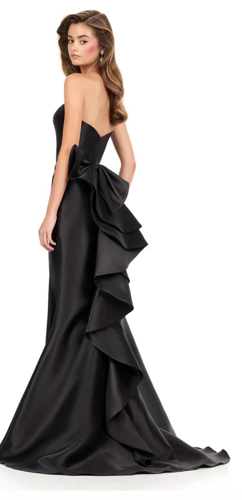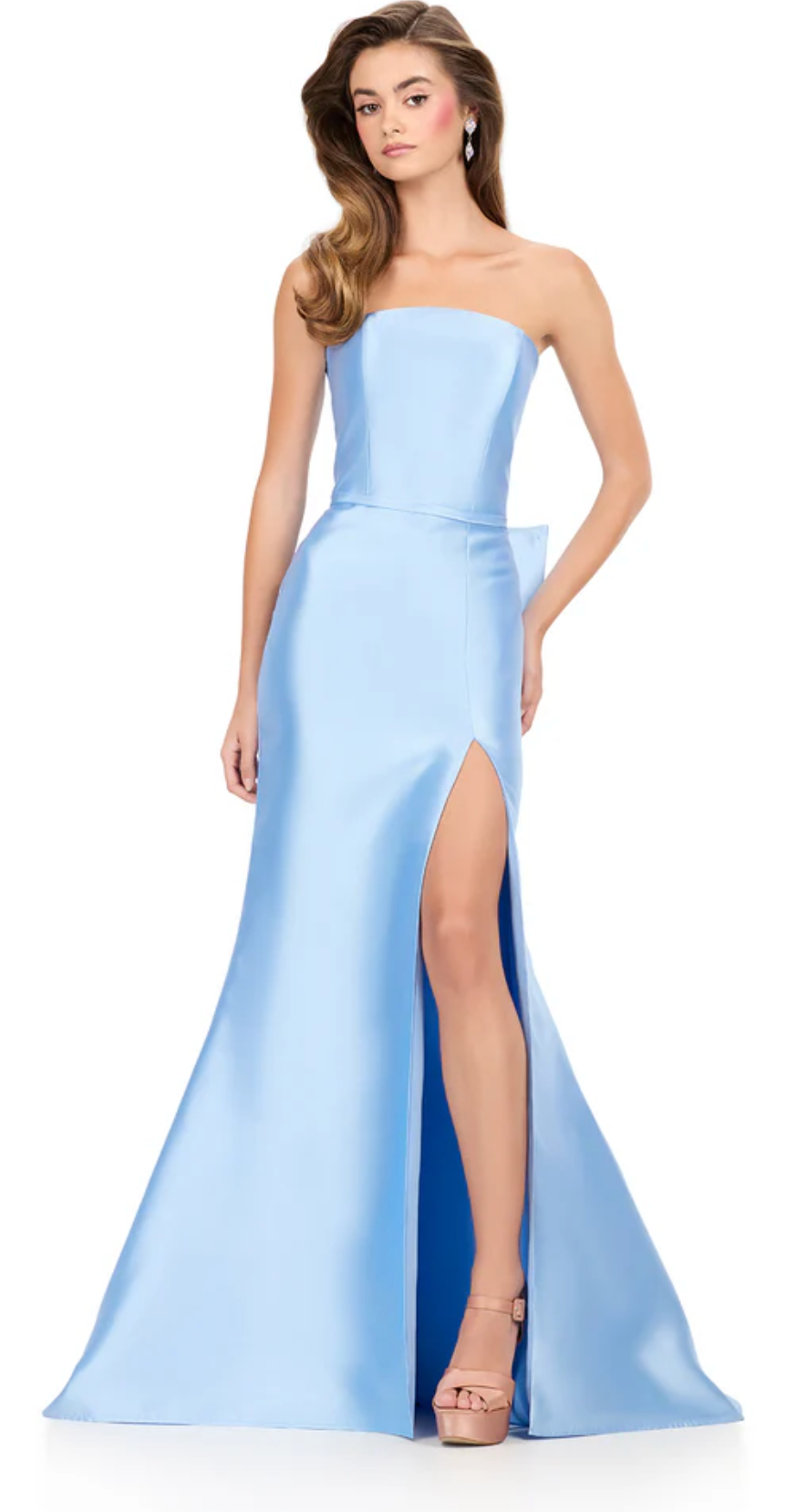 Modern elegance takes shape in Ashley Lauren 12215 with a sleek straight-across neckline that creates a clean and confident look. The fitted bodice provides structure while maintaining a streamlined profile. A statement bow ruffle at the back adds dimension and visual interest without overpowering the design. The long mermaid skirt features a high slit that enhances movement and presence. Ashley Lauren 12215 is an ideal choice for upscale evenings and special occasions that call for refined sophistication. Models are wearing Aqua, Black, Fuchsia, Ice Pink, Lilac, Red, Sky, White, and Yellow colors.