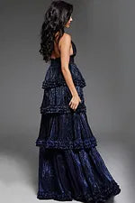 The Jovani 38296 is a stunning tiered metallic ball gown that exudes sophistication and glamour. Featuring a deep V-neckline and spaghetti straps, this gown has ruffled accents that add dimension and texture to its flowing design. Perfect for formal events, this dress combines dramatic style with classic elegance, making it an ideal choice for prom or any special occasion.