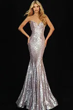 Shimmering strapless fully-sequined floor-length prom dress by Jovani featuring a sweetheart neckline, a midrise back with a zipper closure, and a fitted bodice and waist with a flared hemline.