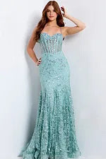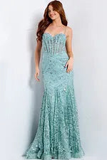 Inspired by timeless artistry, this Jovani 45759 dress exudes elegance with exquisite beading that shimmers delicately. The illusion corset bodice defines the Basque waist, giving structure and form while maintaining softness in its look. Spaghetti straps accentuate the sweetheart neckline, flowing into a trumpet skirt that flares beautifully at the hem. Enchant your audience with Jovani 45759, a sleeveless style that transforms any special occasion into a moment of luxury. Model is wearing Sage color.