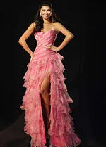 Strapless layered gown with cascading organza ruffles and a flattering high slit, designed to create a soft, romantic silhouette.