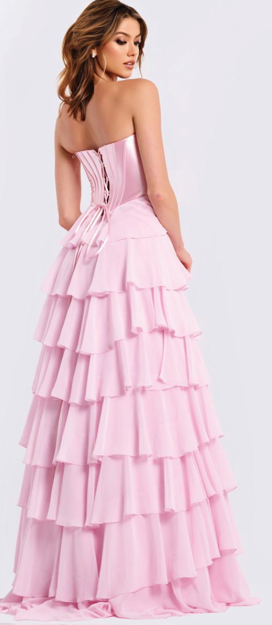 The Jovani 50234 is a stunning strapless sweetheart gown designed to make you feel confident and radiant. This sleek A-line silhouette features astructured satin bodice with a corset design that flatters your figure beautifully. The dramatic tiered ruffle skirt adds movement and elegance, while the high slit offers both sophistication and comfort. Perfect for proms, galas, or special occasions where you want to turn heads and feel absolutely fabulous in every moment.