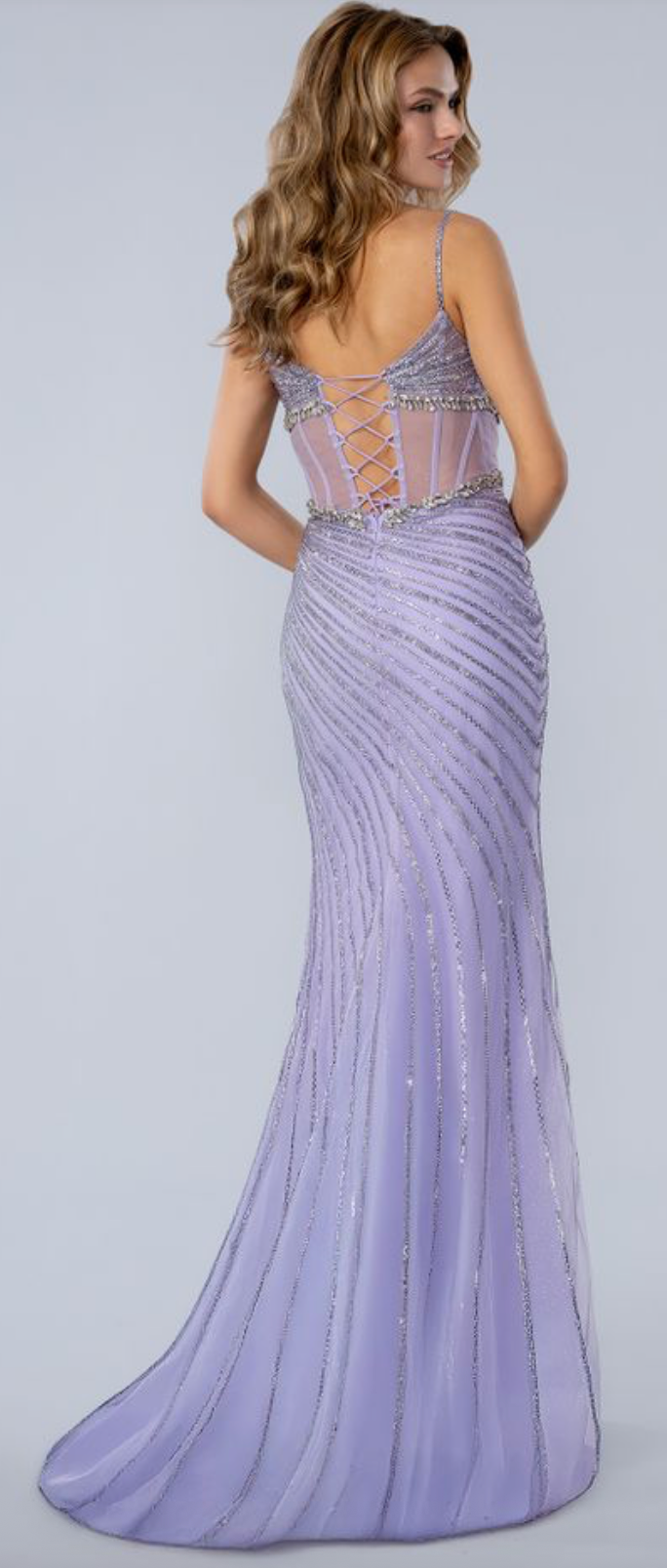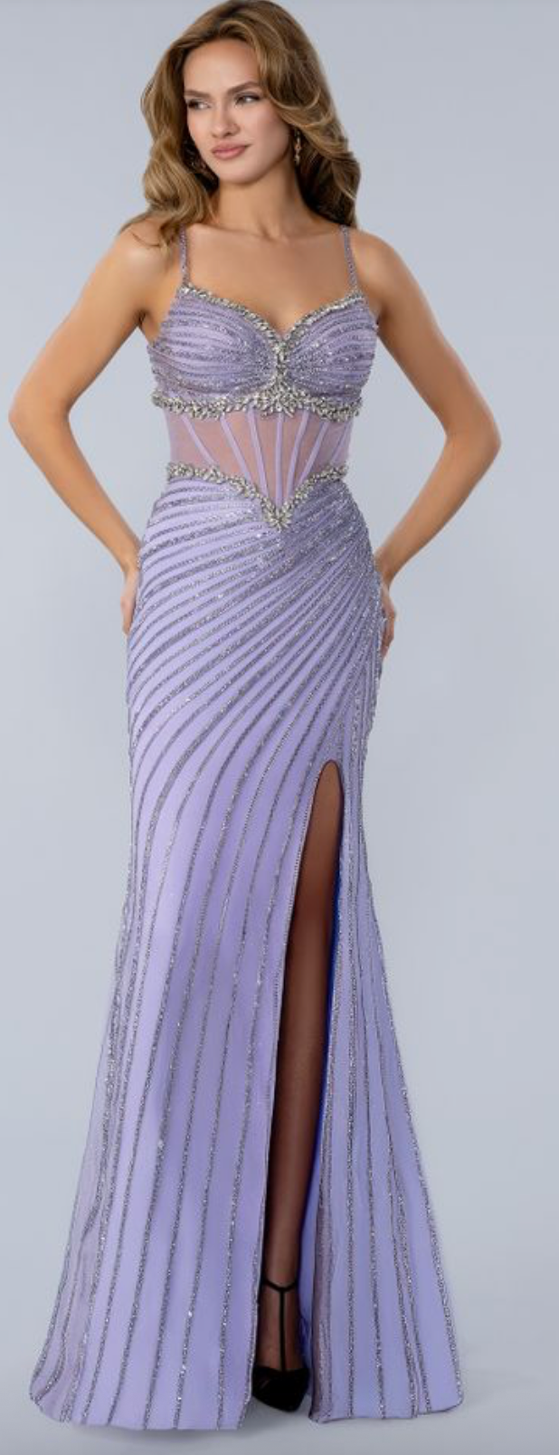 This embellished gown is a formal choice for prom, pageants, or evening galas. It features a fitted column silhouette that flares slightly at the floor-length hem. The bodice is shaped with a sweetheart neckline and thin beaded straps that provide a delicate look. A sheer corset-style midsection includes visible boning for added structure and waist definition. The skirt features a high side slit to allow for easier movement and a more relaxed stride. Intricate patterns of beads and sequins are applied over a mesh shell, creating a textured finish. A lace-up back closure ensures the bodice can be adjusted for a secure and customized fit. This gown works well if you prefer a streamlined fit that emphasizes your natural shape.